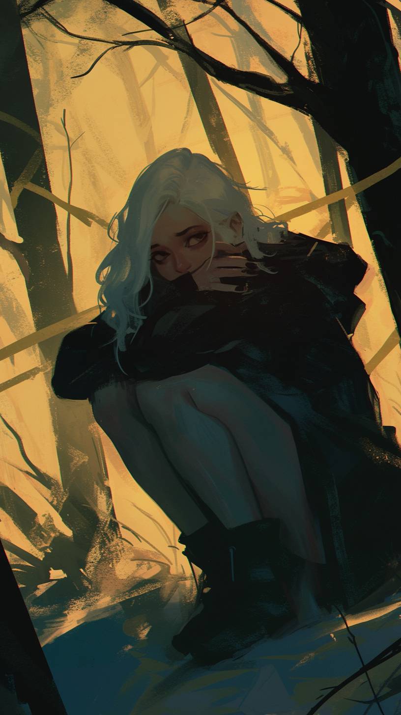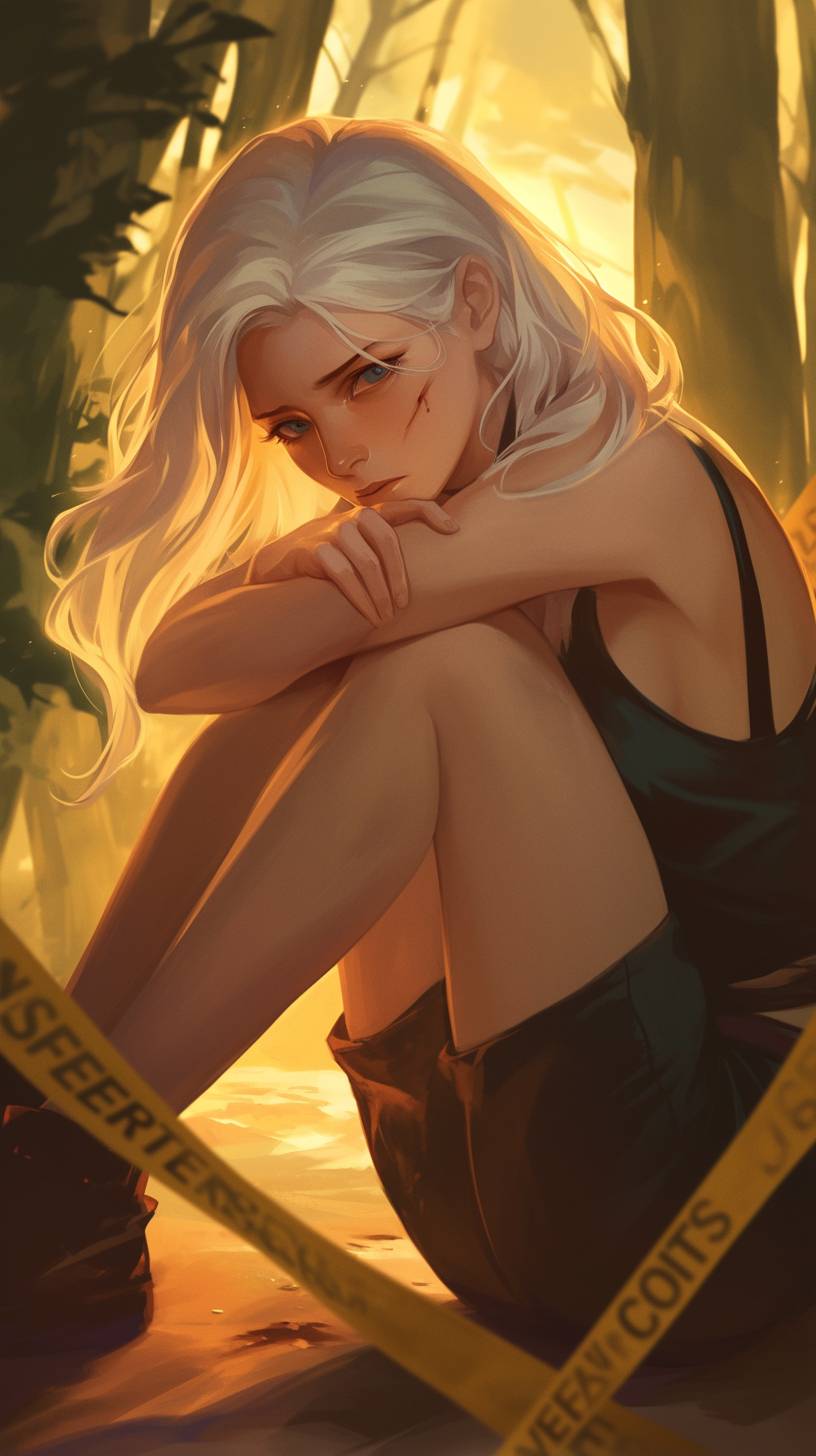 A woman in her mid 20s squatting down while hugging her knees. They’re a large forest behind her and she is currently at a murder scene. Put caution tape around the image. She has an empty expression on her face. She has white hair and empty dark teal eyes. Make it sunset. Give it an ominous vibe. Make it semi realistic. --ar 9:16 --niji 6
