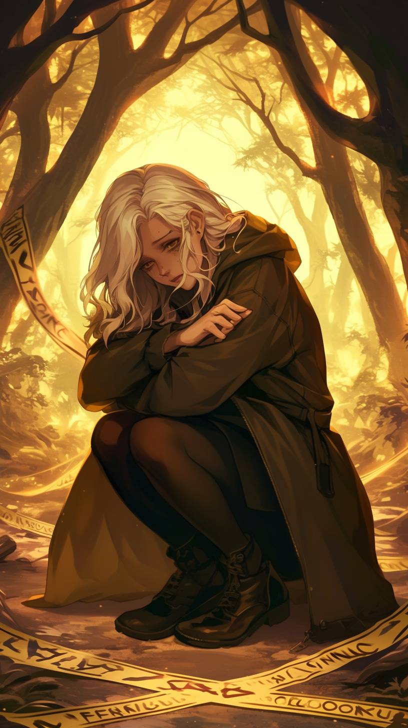 一名二十多歲的女性蹲下,雙膝抱緊。她身後是大片森林,目前正處於一個謀殺現場。周圍纏繞著警戒線。她的臉上沒有表情,白色的頭髮和空洞的深藍色眼睛。夕陽西下,整個場景散發著不祥的氣氛,畫面半寫實。
