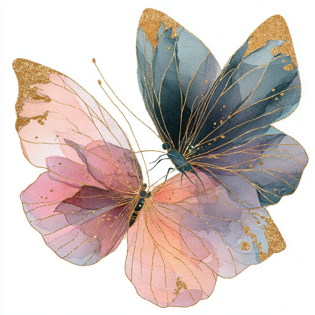 專業水彩剪貼畫(兩隻大型的空靈蝴蝶,透明的翅膀呈粉色到淡灰色的漸變,脈絡用細膩的淺金色閃粉描繪)白色背景,極簡水彩,剪貼畫,較深的輪廓。