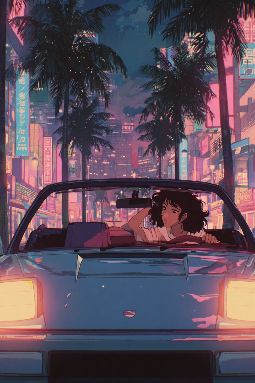 一位時尚女性,擁有蓬鬆的80年代髮型,在夜晚駕駛著一輛敞篷車,80年代復古動漫風格,城市流行美學,霓虹燈牌,棕櫚樹,柔和的粉彩色調,懷舊的膠卷顆粒感。