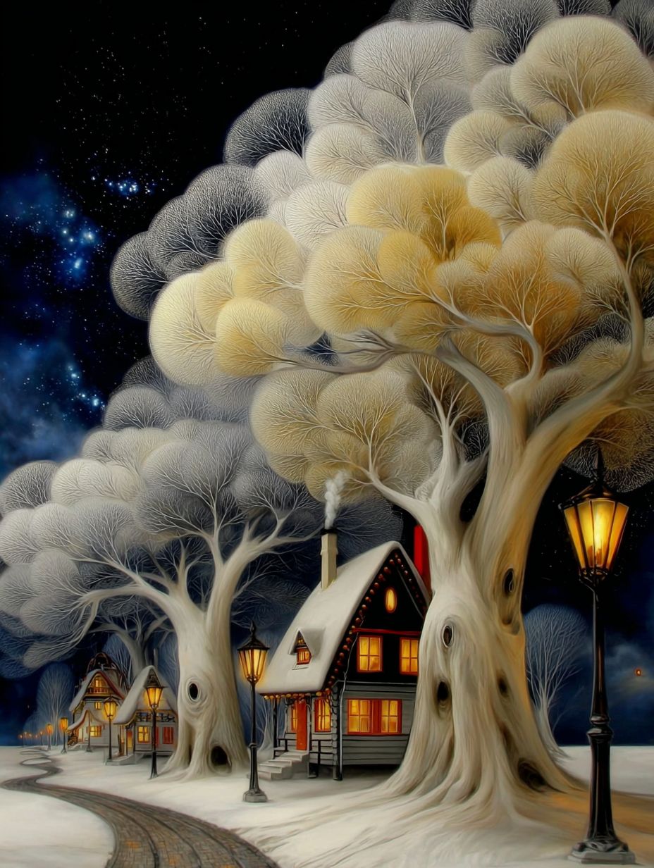 一個寧靜的冬季場景,雪覆蓋的土地,房屋被大樹照亮,星空和溫暖的街燈增添了迷人的氛圍。