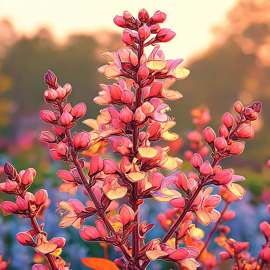 一個被花朵、樹木和動物裝點的迷人花園,由明亮的幾何圖案構成。植物和生物呈現出3D效果,為花園增添了深度,天空中有圖案和彩虹。