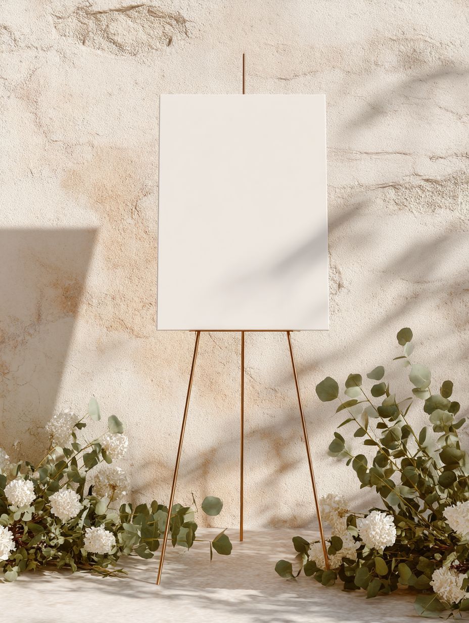 一個逼真的場景,展示了一塊垂直的18x24英寸的婚禮歡迎標誌樣機,放置在一個簡約的金色金屬架子上,背景是質感細膩的淺色石牆。標誌是空白的,溫暖的陽光投射出柔和的陰影。桉樹葉和白色鐵蓮花在架子的底部低矮地排列,呈現出編輯風格。輕盈、通透的構圖非常適合婚禮品牌預覽或場地標識。使用佳能RF 85mm f/1.2L鏡頭拍攝。