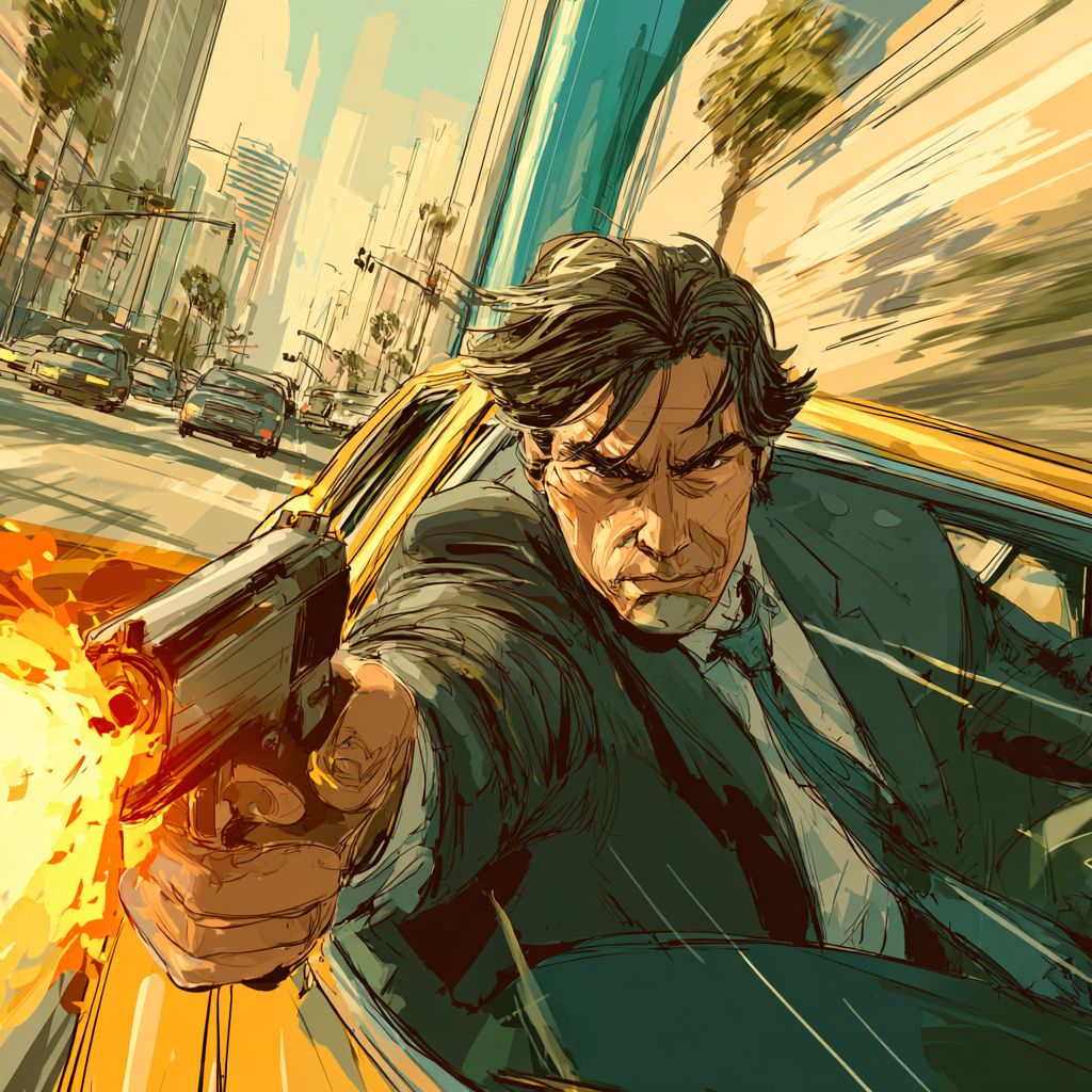 漫畫風格的偵探,似湯姆·克魯斯般在洛杉磯市中心大白天向一輛飛馳而去的汽車開槍。