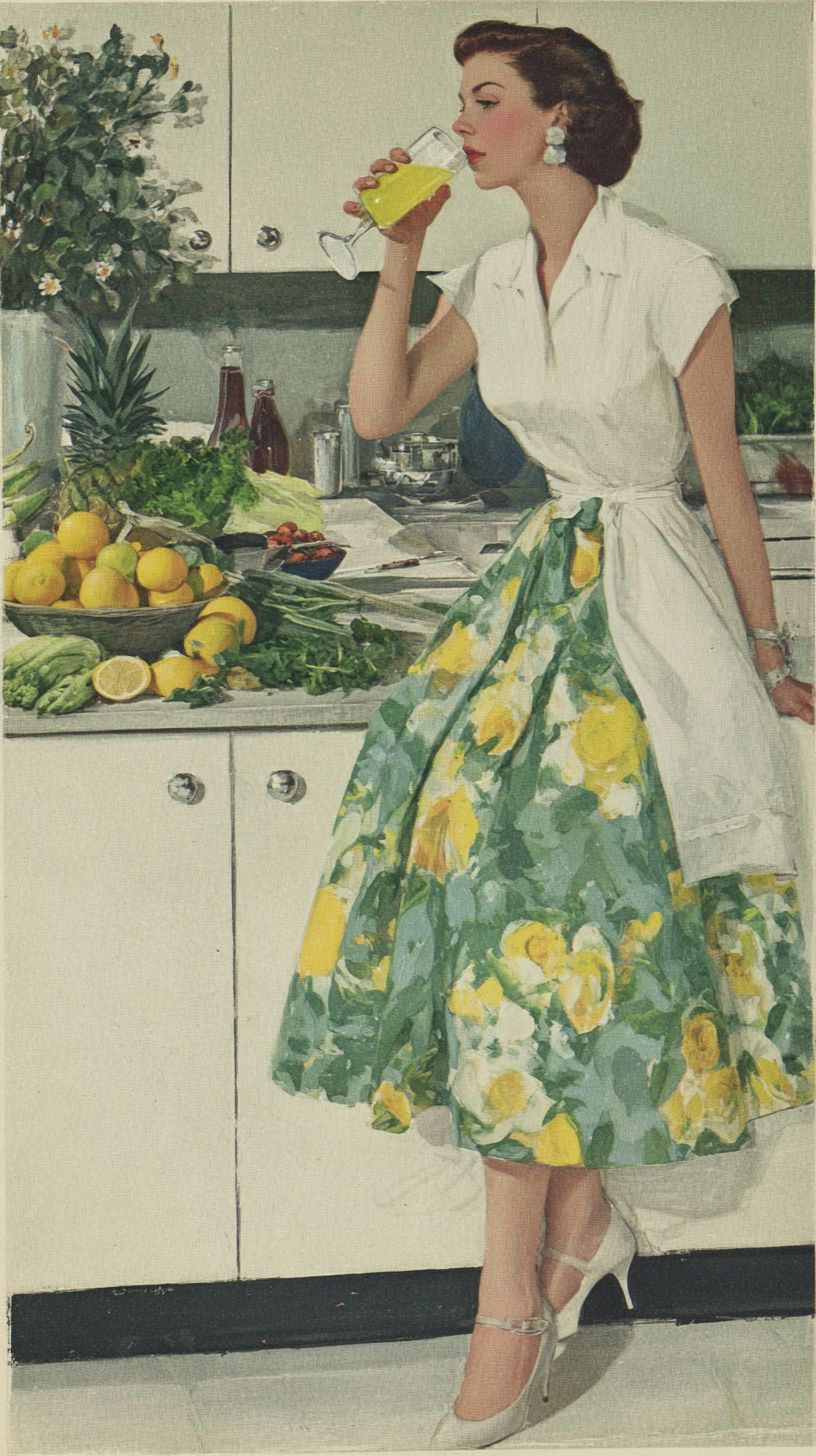 一位1950年代的家庭主婦,穿著具有時期特色的圍裙,在廚房裡喝著一本書風格的雞尾酒,廚房檯面上擺放著新鮮的生薑、剛洗過的檸檬和麥盧卡蜂蜜。