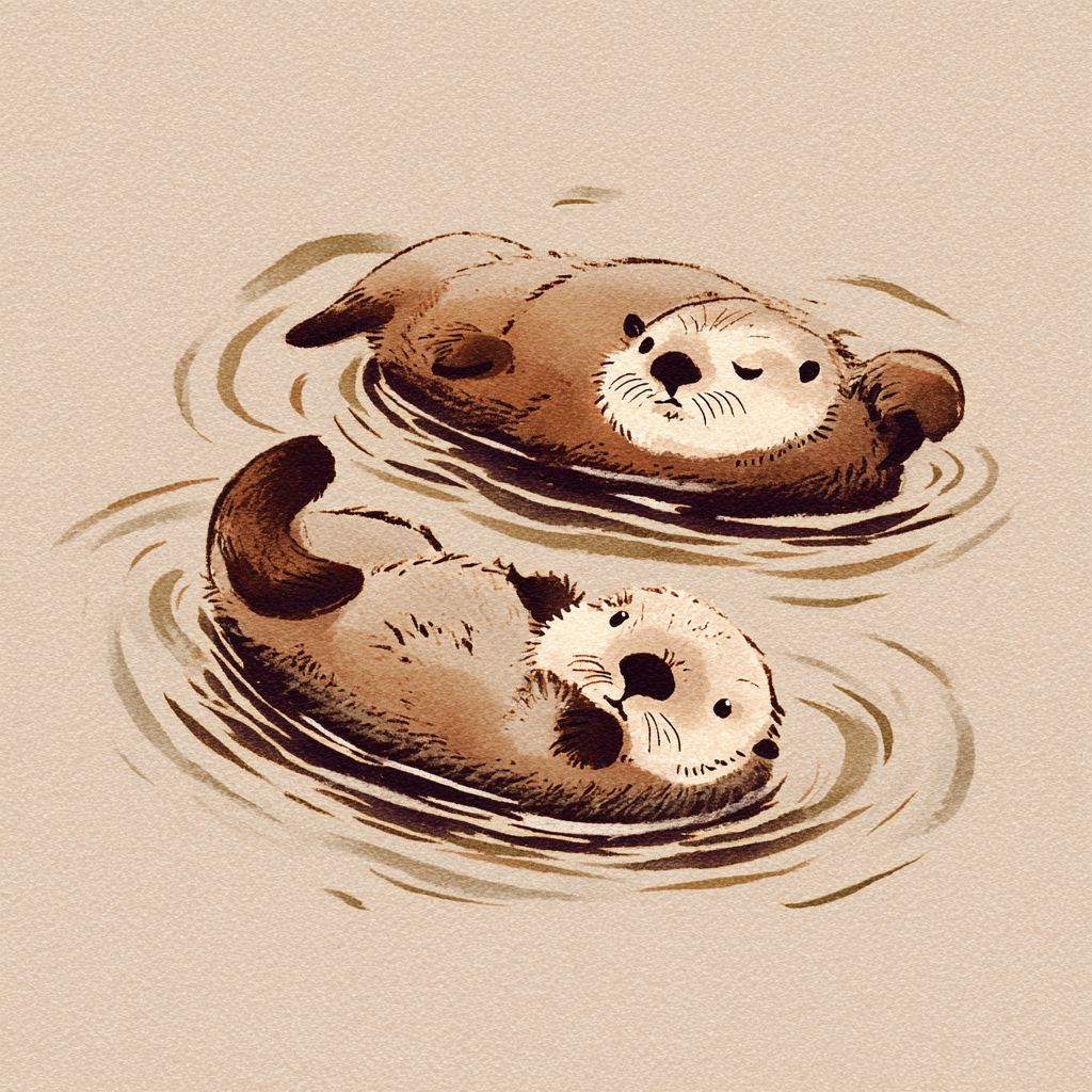 兩隻可愛的海獺浮在水面上,輕輕握著手,周圍的水面平靜。海獺的面部特徵柔和、圓潤,表情甜美,毛髮質感細膩。水面上輕輕勾勒出溫和的波紋,使用簡單溫暖的水彩色調。畫風為手繪,線條溫馨而富有幻想,色調柔和,富有泥土氣息,展現出迷人而真摯的氛圍,風格類似於路易斯·薩查的插圖。沒有背景,專注於海獺和水的波紋。