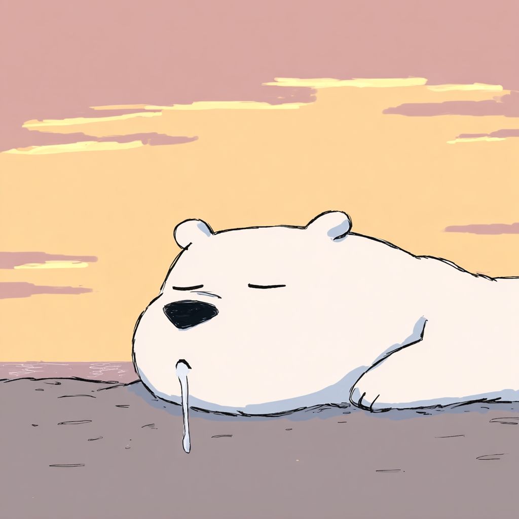 一隻白熊的上半身深深入睡,躺在地上,嘴微微張開,有一絲細密的口水滴落,溫暖的金色夕陽光照耀著,表情寧靜而幸福,暖光在毛髮上投射出柔和的橙色和粉色調,陰影自然地落在身體上,舒適的氛圍,電影般的氣氛,受到漫畫風格的啟發,簡單而乾淨的線條。