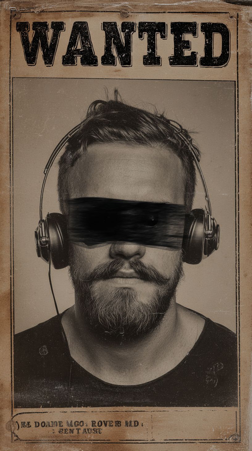 尋人啟事風格的復古海報,懸賞一位失踪的DJ,眼睛用黑色膠帶遮住,穿著耳機。