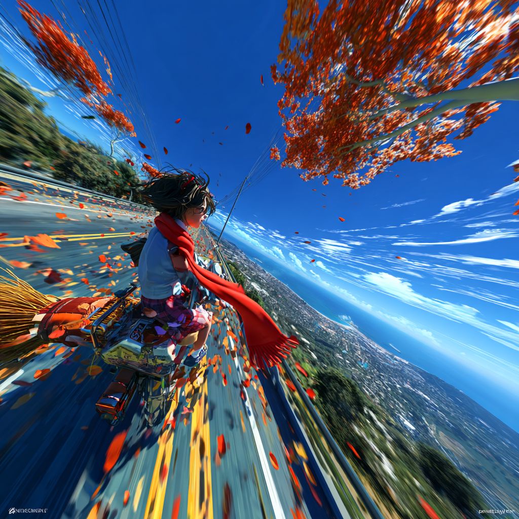 從第一人稱視角,以俯視的方式,構圖包含引導線、運動鏡頭、主題以及在動畫電影《琪琪快遞》中騎掃帚的女孩,捕捉到琪琪在加州的海岸公路上快速而全面的飛行,伴隨著運動模糊和速度線。頭頂是深藍色的天空,橙色的樹葉,紅色的圍巾在風中飄動,遠處的視線中隱約可以看到海浪。高分辨率,超現實的細節和廣角視角傳達冒險和自由的感覺。