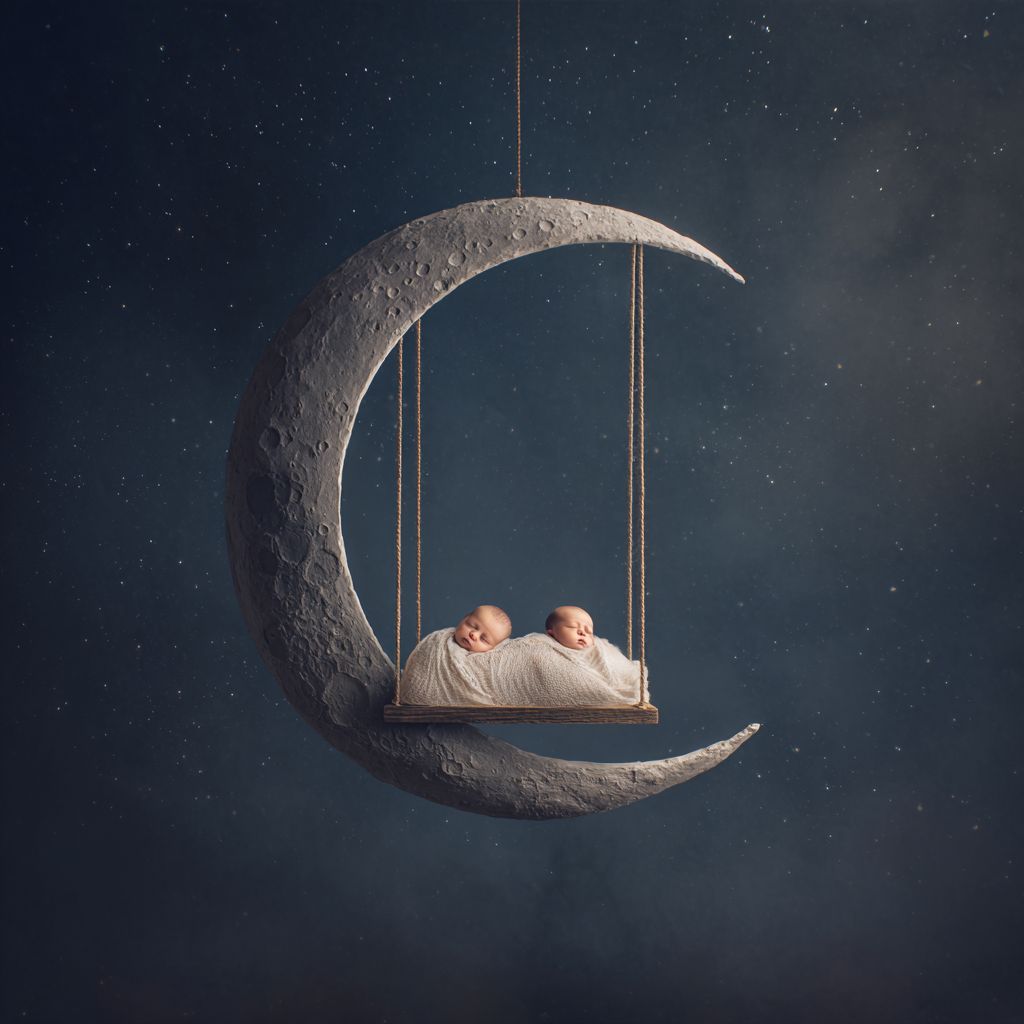 超現實的工作室照片,嚴格的構圖區域。新月佔據了圖像的上半部分,從中心位置到框架的頂部邊緣,完全可見且沒有障礙。圖像的下半部分在月亮和下面的主體之間留有空白。普通的長方形木質嬰兒秋千懸掛在框架的下半部分,位於中下區域,與上方的月亮清晰分離。從月亮底部垂直下降的兩條細金屬鍊接連到秋千,並且與月亮有明顯的垂直距離。秋千沒有接觸、重疊、交叉或坐在月亮內部。兩個正在秋千裡安靜入睡的嬰兒,包裹在柔軟的中性色毛毯中,顯得安詳而安全。月球表面展示出逼真的月球紋理和隕石坑,從上方柔和光照。專業的工作室燈光照亮嬰兒:柔和的主光、微妙的邊緣光,自然的向下陰影。深海軍藍和炭灰色的工作室背景,帶有極少的星星和輕微的光霧以增加深度。寫實的膚色,真實的重力和材料。沒有幻想光環。沒有插圖。沒有 CGI 效果。沒有超現實元素。高端的新生兒攝影與奢華的藝術工作室攝影相結合。使用全畫幅單反相機拍攝,85mm 鏡頭,f/1.8,ISO 200,淺景深,超清晰的焦點,博物館級的逼真,8K 細節。