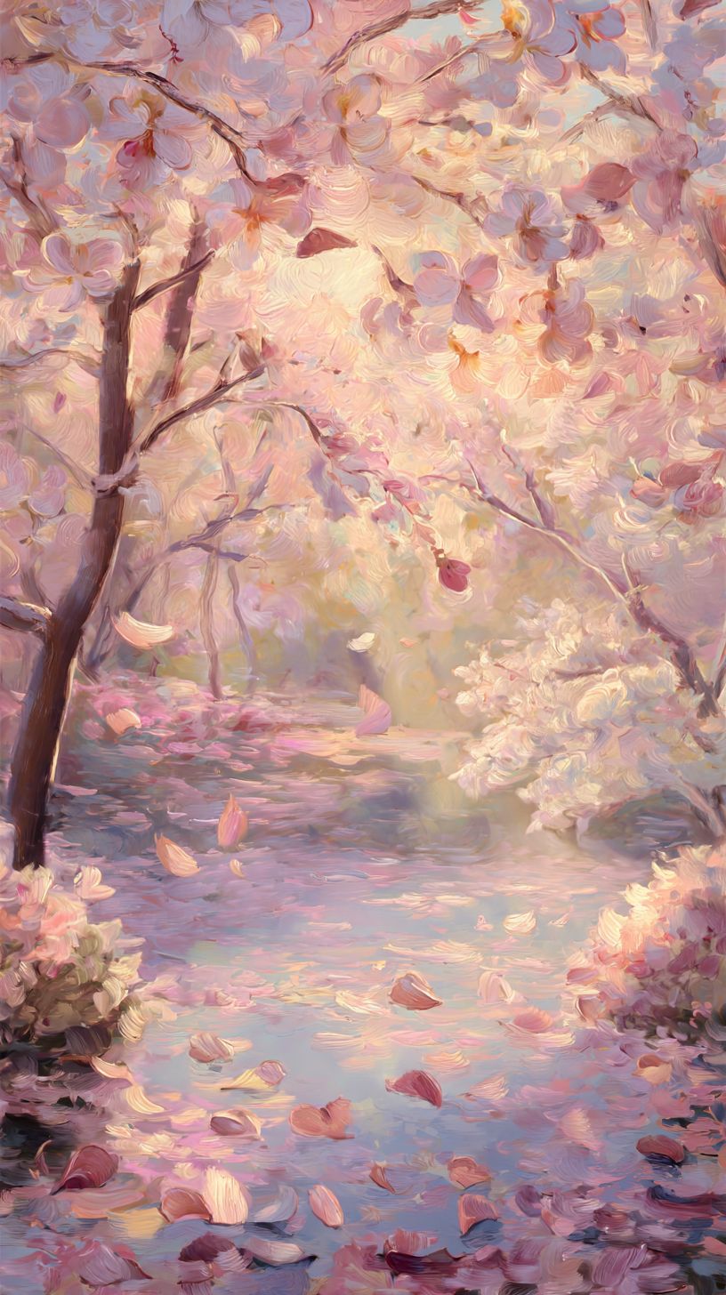 充滿盛開櫻花樹的日式花園,莫奈風格的印象派,超柔軟的畫筆觸,花瓣輕輕漂浮在空中,溫暖的陽光透過樹枝洒下,柔和的粉色和奶油色,朦朧的光線,夢幻般的飄渺氛圍,寧靜而浪漫的心情