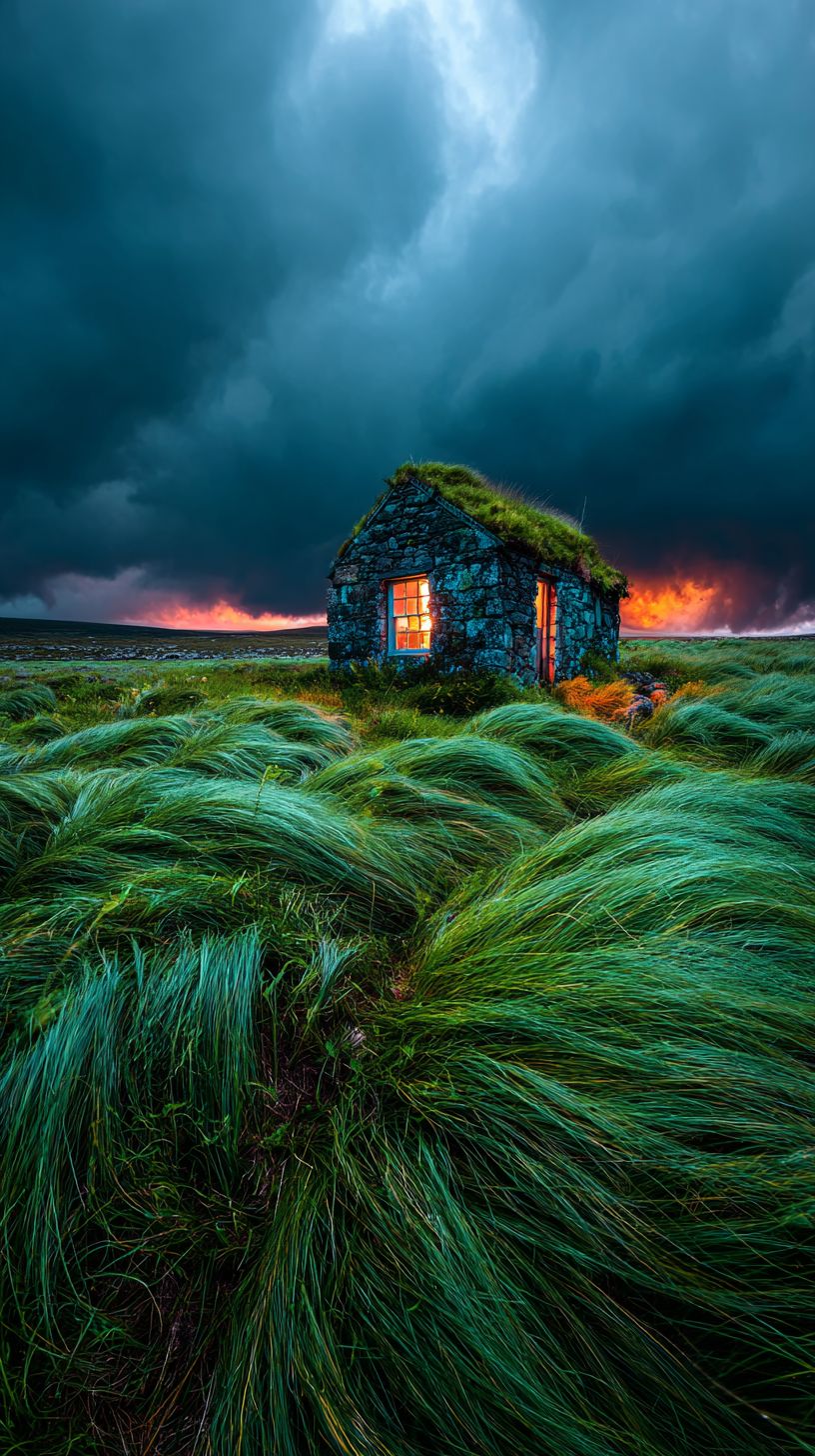 一個小而風化的石頭牧羊小屋獨自坐落在一片廣闊、起伏的深綠色草地上。草高而茂盛,在風中搖曳。此時是晚藍小時。小屋有一個小窗戶,發出強烈溫暖的琥珀色光芒。天空是深靛藍的雲層與地平線上燃燒的橙色火焰的戲劇性混合。陰暗、情緒化、電影質感、超現實、8k,濕潤草地紋理的清晰對焦。