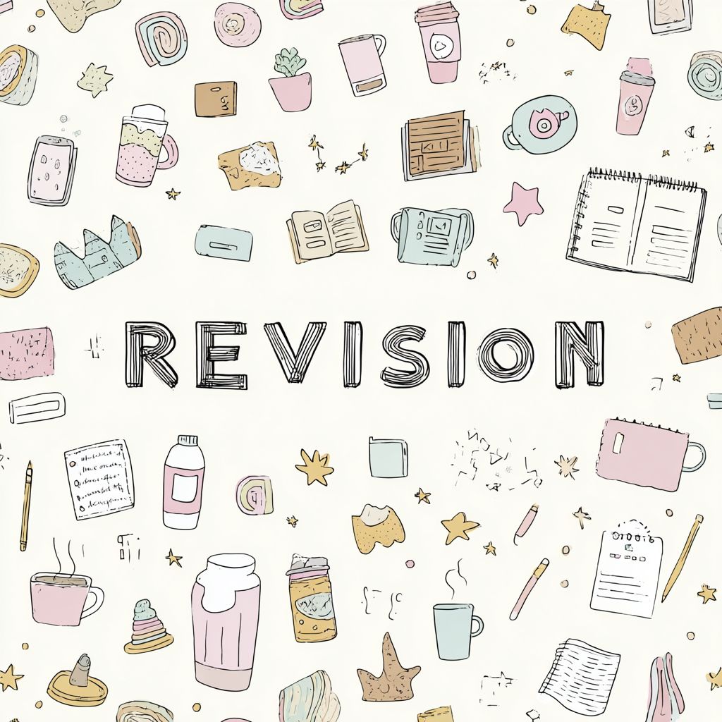 一幅代表「修訂」的圖片,採用流行的子彈日記風格,極簡主義塗鴉美學,乾淨的線條,柔和的粉彩色調,舒適而富有奇幻感,適合用於產品,沒有背景,高分辨率,類似矢量的清晰度。