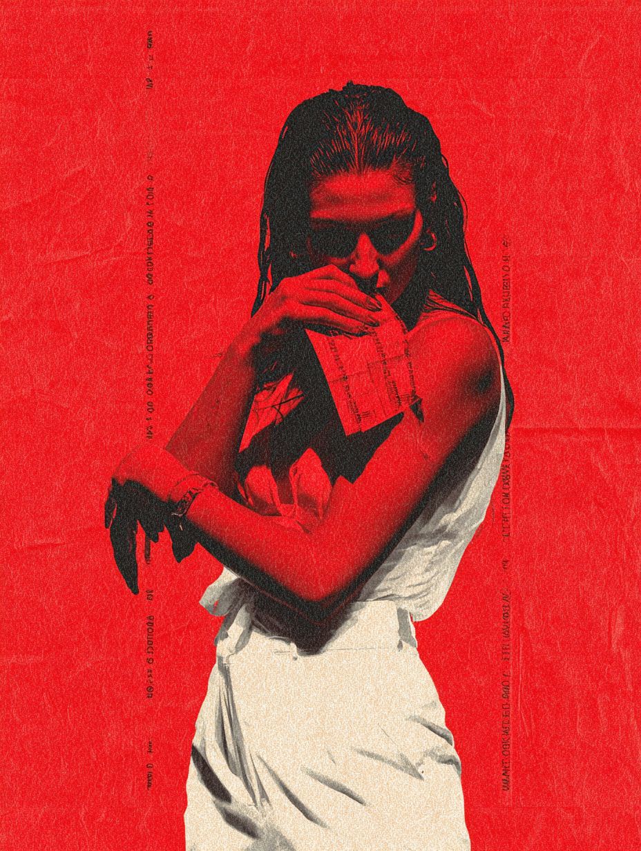 高對比度的編輯海報,深紅色的紋理背景,黑白色的雕塑女性形象,電影般的燈光,簡約構圖,殘酷主義平面設計,反社交媒體美學,顆粒感的膠卷質感,戲劇性的陰影,前衛時尚編輯,1970年代歐洲藝術電影海報,強烈的克制,無文本,無標誌