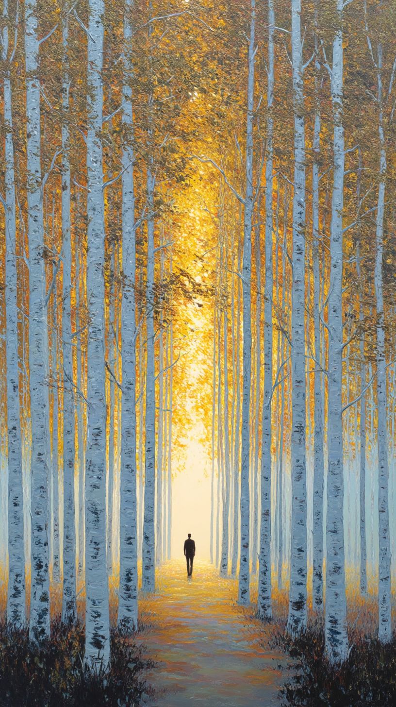 在金色時光下的極簡白樺森林小徑,一道身影朝著燦爛的空地走去,長長的影子,細緻的樹皮紋理,柔和的光暈,高潔的構圖,照片般的真實感,富有詩意和沉思,強烈的藝術表現力,電影般的色調。