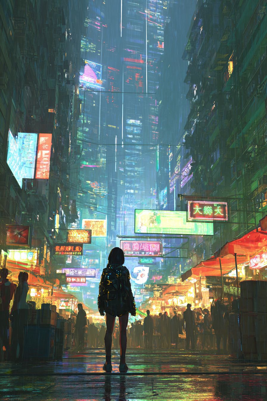 一個女性黑客在夜晚熙熙攘攘的街市中走過,賽博朋克動漫風格,聳立的摩天大樓,立體廣告,傾盆大雨,霓虹燈牌倒映在濕滑的人行道上,陰暗而反烏托邦。