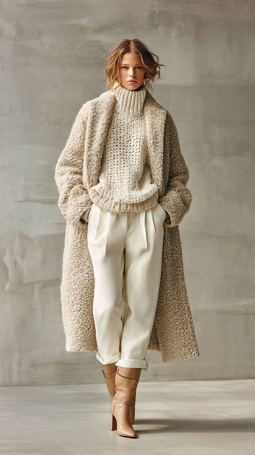長毛呢外套,高檔針織毛衣,直筒冬季褲子,粗跟 ankle 靴子,溫暖的中性色調,柔軟的面料質感,真實的材料