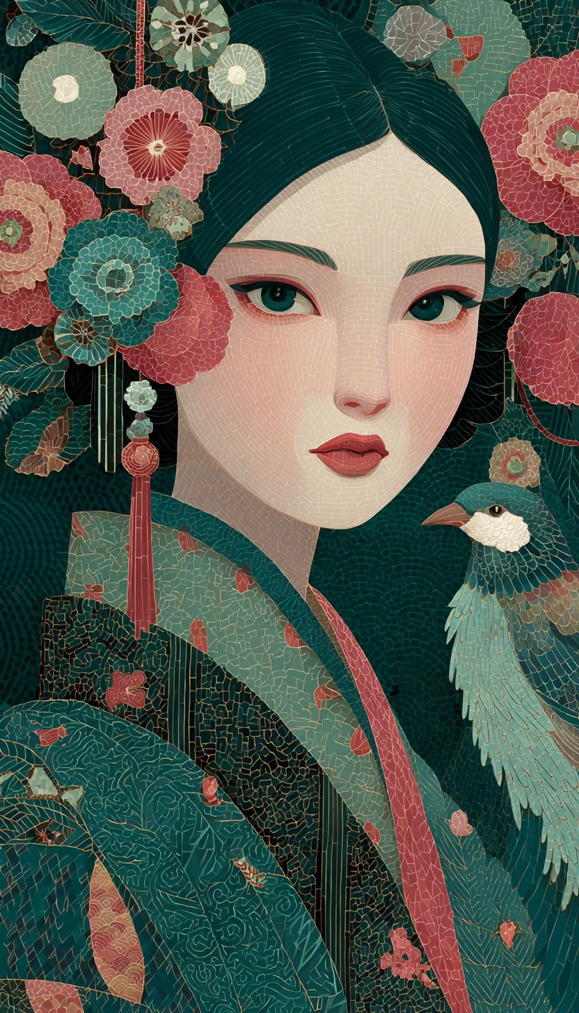 一幅日本女性的數字插圖,她有美麗的細長眼睛,靈感來自日本繪畫,逼真的鳥類插圖,深銀色和時尚粉色,翡翠綠色,超高清圖像,立體派肖像,吸引人的歌妓肖像。