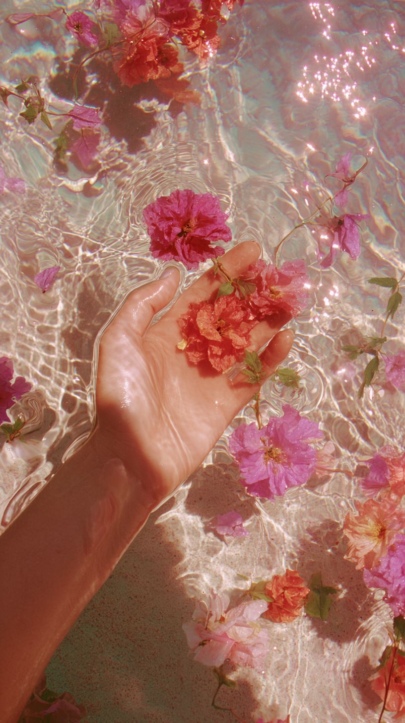 一張描繪女性手部部分浸入水中的照片,水面漂浮著粉紅色和紅色的花朵。陽光反射在濕潤的地面上,營造出柔和的、粉彩色的、空靈的美感。照片是從上方拍攝的,風格類似於佩特拉·柯林斯。